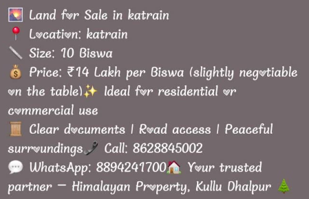 A great opportunity to own 10 biswa of premium land in the beautiful region of Katrain, Kullu. This property is perfectly suited for residential or commercial use, offering excellent potential for building a home, guesthouse, cottages, or investment projects. With clear documents and convenient road access, the land ensures a smooth buying process and easy future development. The peaceful surroundings, fresh mountain air, and scenic environment make it an ideal location for those seeking serenity without compromising connectivity.
