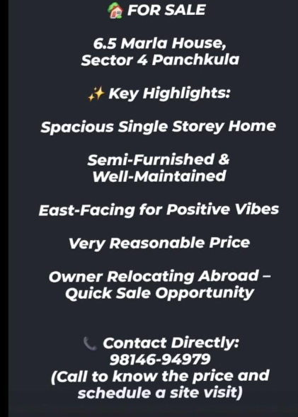 A beautiful 6.5 marla single-storey house is available for sale in Sector 4, Panchkula. This spacious and semi-furnished property has been well-maintained and thoughtfully designed to offer maximum comfort and functionality. With an east-facing layout, the home receives abundant natural sunlight, creating a bright and uplifting atmosphere with positive energy throughout the day.