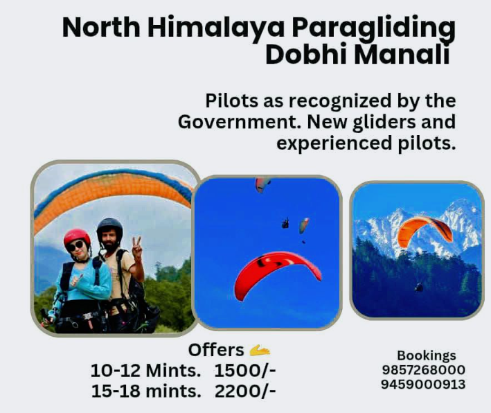 Experience the thrill of soaring above the breathtaking Himalayan landscapes with North Himalaya Paragliding, Dobhi. Located at Counter No. 13.13, we offer safe, professional, and unforgettable paragliding adventures for all enthusiasts. Enjoy smooth takeoff points, stunning valley views, and highly trained pilots ensuring a secure and memorable flight. Choose from our exciting offers starting at ₹1500 and ₹2000, giving you the perfect chance to experience high-quality paragliding at unbeatable prices. Whether you’re an adventure seeker, nature lover, or first-time flyer, Dobhi’s scenic beauty and ideal flying conditions promise an experience you’ll cherish forever. Book your flight now and get ready to glide over majestic Himalayan landscapes. 📞 Contact: 9857268000